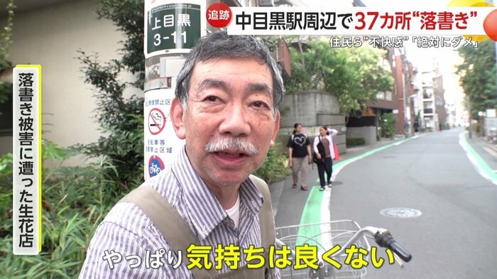 近隣住民は「なんて書いてあるのかわからないけど」、「ダメです。許可取ってないでしょ、こんなもの。勝手にやってるんでしょ、絶対ダメです、こんなの」、「せっかくの中目黒がもったいない」などと話した。