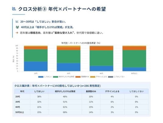 これは、男性美容の一般化とともに、従来タブー視されてきたVIOケアが日常的な身だしなみとして浸透しつつあることを示しています。パートナーに対しても柔軟かつ前向きな意識が広がっており、男女ともに受け入れられる新しいスタンダードが形成されつつあると言えます。