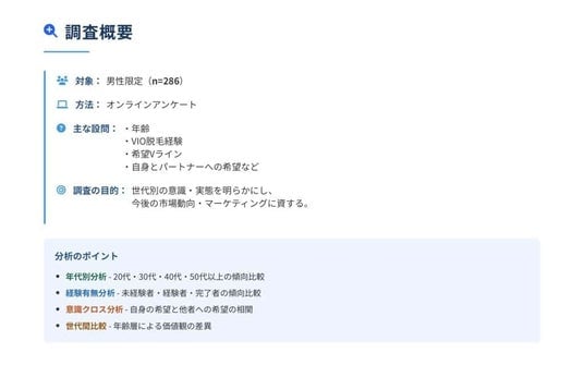多くの男性はまだVIO脱毛未経験である一方、すでに約15%が実際に脱毛を経験していることが明らかになりました。潜在的なニーズは大きいと考えられます。