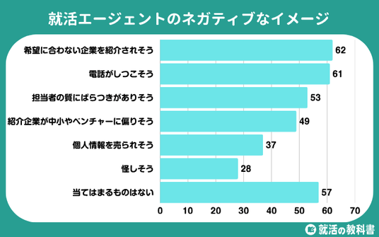 就活エージェントのネガティブなイメージで最も多いのは「希望に合わない企業を紹介されそう」(62人)でした。