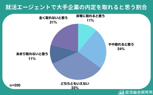 就活エージェントを利用して大手企業の内定を「非常に取れると思う」(11.0%)と「やや取れると思う」(24.0%)と答えた就活生は合わせて35.0%でした。
