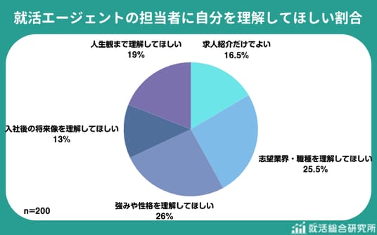 また、「志望業界・職種を理解してほしい」(25.5%)や「人生観まで理解してほしい」(19.0%)と答えた学生も多く、自分自身を深く理解してもらいたいと考える学生が多数派であることがわかりました。