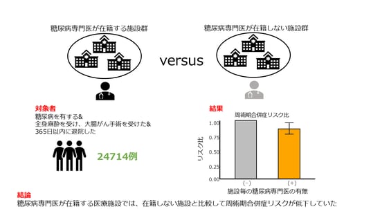 本研究では施設毎の糖尿病専門医の在籍の有無と、大腸がん手術の周術期合併症リスクの関連性を検討することを目的としました。