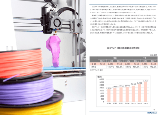 会員制マーケットリサーチサービスを提供している、株式会社SVPジャパン(本社:東京都中央区、代表取締役社長:橋本 雅、以下「SVPジャパン」)は、本日、SVP注目市場分析レポート「3Dプリンター材料-世界市場の現状と将来展望-」を、会員企業向けに公開いたしました。
