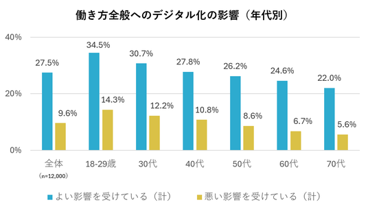 1.デジタル化が進んでも働き方全般の変わらない人は約半数、デジタル化でよい影響を受けている人の方が悪い影響を受けている人よりも多い