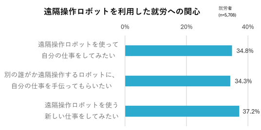 デジタル化と働き方の多様化によって、ロボットの可能性が広がっている。ロボットを遠隔操作して働くことへの関心について、現在働いている人(就労者 n=5,708)を対象に尋ねた。「遠隔操作ロボットを使って自分の仕事をしてみたい」(34.8%)、「別の誰かが遠隔操作するロボットに、自分の仕事を手伝ってもらいたい」(34.3%)、「遠隔操作ロボットを使う新しい仕事をしてみたい」(37.2%)となり、働いている人の3人に1人が遠隔操作ロボットを利用する就労に関心をもっている。