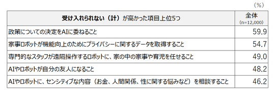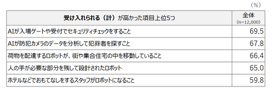 4.AIやロボットが日常生活で活用されることについて、受容度が高いのは入場時のセキュリティチェックや防犯カメラでの活用、荷物配達ロボットなどで、受容度が低いのは政策決定や家の中のプライバシーに関わるもの