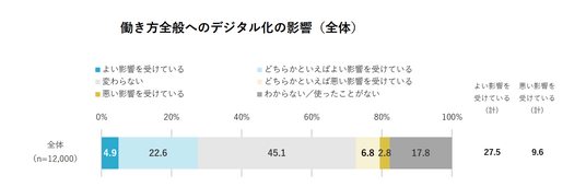 デジタル化が進んでいることによって、よい影響を受けているか悪い影響を受けているかを尋ねたところ、働き方全般については「変わらない」が45.1%でもっとも多く、「よい影響を受けている(計)」が27.5%、「悪い影響を受けている(計)」が9.6%、「わからない/使ったことがない」は17.8%であった。