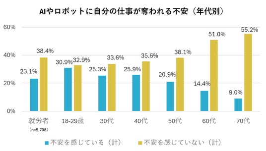 AIやロボットに自分の仕事が奪われる不安(年代別)