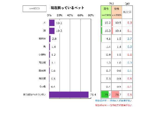 「ペット」と聞いて、最初に思い浮かべるペット、現在飼っていないが、過去に飼ったことがあるペットについては、どちらも犬のほうが猫より割合が高くなっていますが、現在飼っているペットについては、犬も猫も、どちらも10.3%と同じ割合になりました。