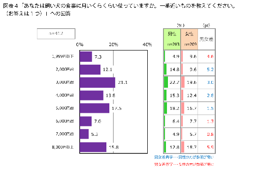 また、飼い犬の食事代を聞くと(図表4)、最も割合が高いのは「3,000円台」(21.1%)で、次いで「5,000円台」(17.5%)でした。「5,000円台」以下を合計すると、67.9%と、約7割になります。