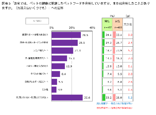犬に限らずペットを飼っている人に、ペットの健康に配慮したペットフードを利用してるか、利用したことがあるかを聞くと(図表5)、「利用していない・使用したことがない」人が30.6%でした。