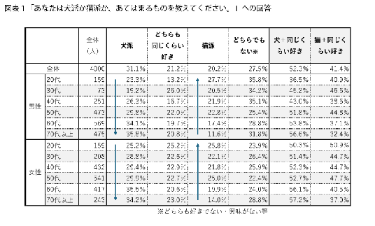まず、犬派か猫派かを聞くと(図表1)、「犬派」が31.1%、「猫派」が20.2%、「どちらも同じくらい好き」が21.1%でした。