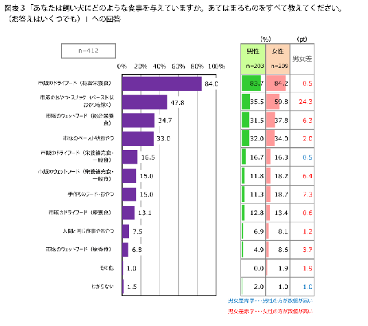 次に、現在、犬を飼っている人を対象に、普段、どのような食事を与えているかを聞きました(図表3)。