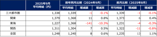 9月度のエリア別平均アルバイト時給は、関東、関西、全国で前年同月を上回る。