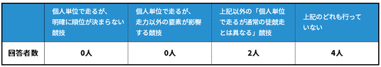 設問1で「徒競走を実施していない」と答えた人のうち、「個人単位で走るが、明確に順位が決まらない形で競技を行っている」「個人単位で走るが、走力以外の要素が影響する形で競技を行っている」と回答した人は、ともに0人でした。