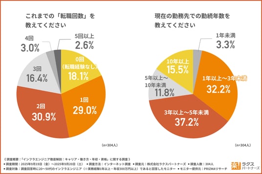 転職や勤続年数の分布からは、数年ごとの職場変更と長期定着の両方がバランスよく共存しており、キャリア戦略における「正解」が一つではないことがうかがえました。