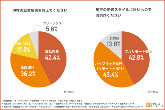 インフラエンジニアという職種の性質上、場所に縛られずに仕事ができる要素が強いことを示しています。出社のみという体制は少数にとどまっており、柔軟性のある働き方が業界基準になりつつあるようです。
