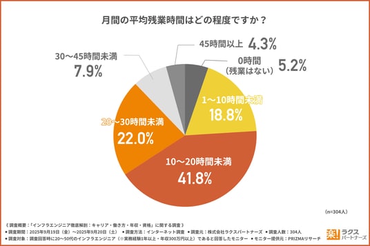 約4割が「月10~20時間未満」と回答し、極端な残業はない様子がうかがえます。