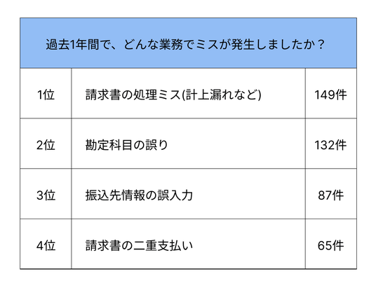 上記の図は本資料のランキング結果から一部抜粋したものです。上記の図によると過去1年間で最も多く発生した経理ミスは「請求書の処理ミス(計上漏れ・仕訳間違い)」で149件 に上りました。次いで「勘定科目の誤り」(132件)、「振込先情報の誤入力」(87件)が続きます。
