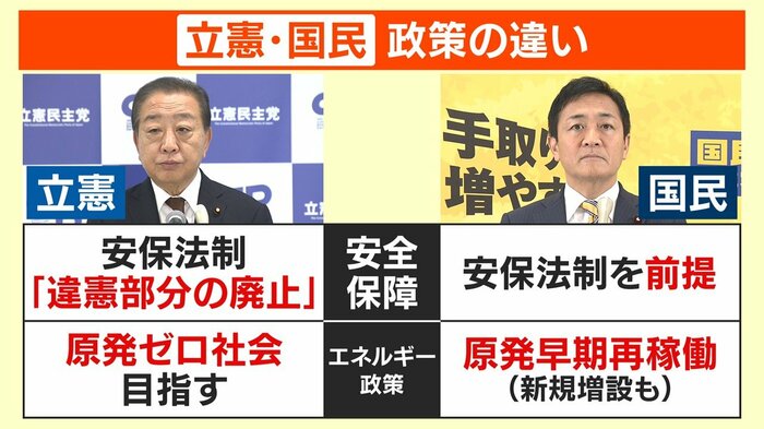 しかし、安全保障の面では「安保法制・違憲部分の廃止」を求める立憲民主党に対して、国民民主党は「安保法制を前提」としています。さらに、エネルギー政策においても、「原発ゼロ社会を目指す」立憲に対し、国民民主は「原発早期再稼働(新規増設も)」を望んでいます。