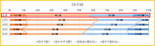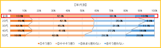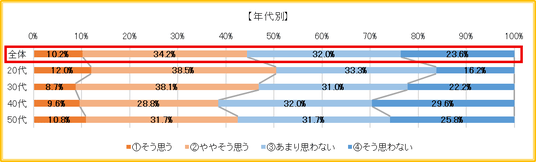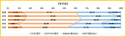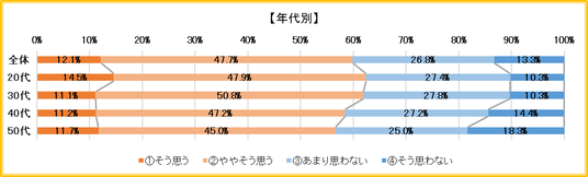 年代別にみると、20代(63.2%)・30代(65.1%)はともに「思う」が6割超だが、40代(59.2%)、50代(53.3%)は徐々に減少していく傾向が見られた。