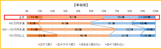 年収別に見ると、最も「思う」の割合が高いのは、年収700万円以上ではなく、400~700万円の中間層となった。