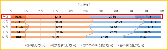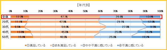 全体では満足(1.満足+2.まあ満足)が53.0%、不満(3.やや不満+4.不満)が46.9%と、拮抗する結果となった。