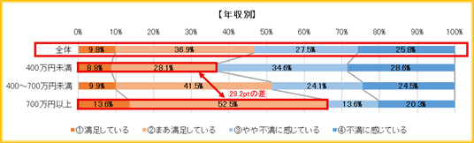 年収別にみると年収が上がるにつれて満足の割合は増加し、「不満」は減少する傾向が見られた。特に、年収400万円未満と700万円以上では満足の割合に29.2ptの差がついた。一方で、年収700万円以上でも33.9%が「不満」と回答しており、約3人に1人は会社の待遇に満足していないことがうかがえる結果となった。