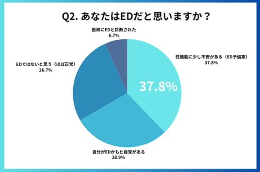 「性機能に少し不安がある(ED予備軍)」と回答した方が37.8%でした。「EDかも」と感じている方が約28.9%と性機能に違和感や不安感を覚えている方が多いとわかりました。しかし26.7%の方は「EDではないと思う(ほぼ正常)」と興味本位で試されている方もいます。