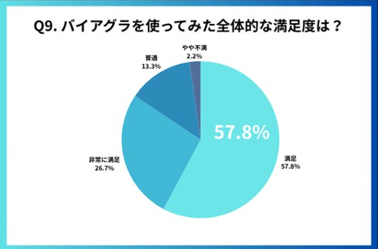 「満足」「非常に満足」と回答した方が全体の約84.5%を占め、多くのユーザーがバイアグラに対して肯定的な印象を持っていることがわかりました。全体的に高い満足度が示されました。