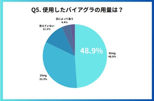 バイアグラの使用用量として「50mg」の用量を使用している方が48.9%と多い結果となりました。用量が増えることで副作用を感じる方も多いため33.3%の方が25mgの最小量から進められる方も多いようです。また「日によって違う」や「覚えていない」と回答されている方もいました。