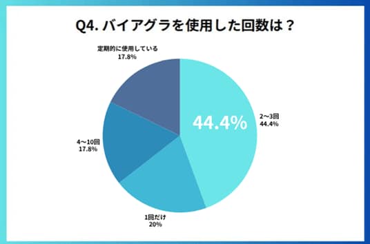 「2~3回」使用したと回答した方が44.4%と多い結果になりました。また「4~10回」と複数回使用している方が17.8%。「定期的に使用している」と回答した方は17.8%とEDの度合いで個人差があるようです。