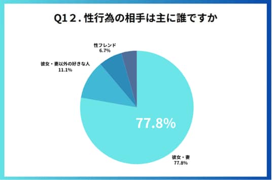 性行為の相手として最も多かったのは「彼女・妻」で77.8%にのぼり、圧倒的多数を占めました。「性フレンド」との回答は11.1%ありましたが、「不特定の相手」や「彼女・妻以外の好きな人」という回答はなく、比較的安定した関係性の中でバイアグラが使用されていることがわかりました。