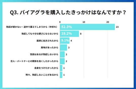 ・バイアグラ購入きっかけは「勃起が続かない・途中で萎えてしまうから(中折れ)」が52.3%