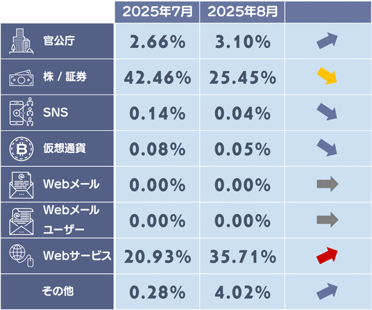 SBI証券の報告数が減ったことにより、「株/証券」のカテゴリが減少しました。またTEPCO、ETC利用照会サービスが増加したことで「Webサービス」のフィッシングサイトが増加しています。