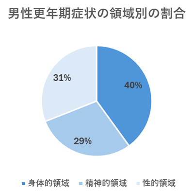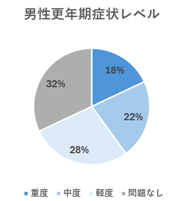 続いて、男性更年期治療に関して国際的に使われている自己診断チェックシートを用いて調査したところ、男性更年期の疑いがある人が68%いることがわかりました。症状レベル別では、重症の人が18%、中等度の人が22%、軽度の人が28%という結果となりました。また身体の不調を感じている領域としては、身体的領域(40%)が最も多く、次に性的領域(31%)、心理的領域(29%)、と続きました。