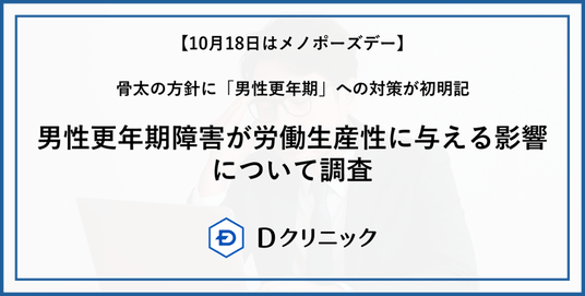 Dクリニック(東京、新宿、札幌、大阪、名古屋、福岡 計6クリニック)では、10月18日の“メノポーズデー”を迎えるにあたり、男性120名に対してAMSスコア(男性更年期障害の症状を評価するための質問票)と、WHO-HPQスコア(健康問題が労働パフォーマンスに与える影響を測定する質問票)について調査※1を実施いたしました。