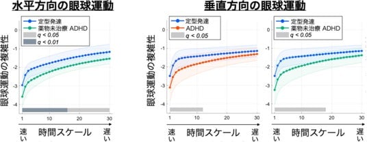 図2. 水平方向と垂直方向における眼球運動の時間的複雑性の群間比較/眼球運動では、ADHD群は定型発達群に比べ時間的複雑性が低い値を示しました。水平方向は薬物未治療ADHDで、垂直方向はADHD全体および薬物未治療ADHDで有意差が確認されました(q<0.05)。中央の点は平均値、エラーバーは標準偏差を示します。q値は、多重比較に伴う偽陽性率(FDR)を制御した検定の有意度を表します。