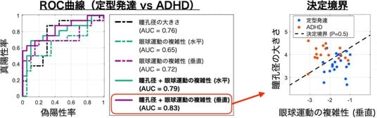 図3. 定型発達とADHDの分類性能(ROC曲線)と決定境界/定型発達とADHDの分類では、左図のROC曲線が瞳孔径と眼球運動の時間的複雑性を統合したモデルの方が、各単独指標より高い識別性能であることを示しています(AUCは1に近いほど高性能)。右図の決定境界(P=0.5において分類モデルが定型発達とADHDを分ける判別線)の傾きは、両指標が相補的に分類へ寄与していることを示唆します。※薬物未治療ADHDなどの詳細は原著論文を参照してください。
