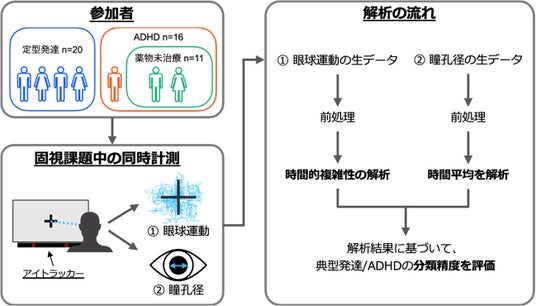 本研究では、成人の定型発達20名とADHD16名(うち薬物未治療11名)を対象に、2分間の固視課題中の眼球運動(水平・垂直)と瞳孔径を同時計測しました(図1左)。眼球運動はマルチスケール・エントロピー解析(用語説明*2)で時間的複雑性を評価し、瞳孔径は時間平均で定量化しました(図1右)。さらに、得られた特徴量を用いて、L1(Lasso)ロジスティック回帰で定型発達とADHDの分類性能を検証しました。