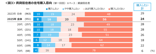 賃貸居住者の住宅購入意向を聴取した。購入したい(購入+やや購入したい)は24%であり、20~40代の購入意向は2割台後半。2023年と比べ建築資材・人件費の高騰や金利の上昇からか、購入意向は5pt低下した。<図3>