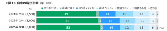 自宅の居住形態は、「持ち家戸建て」が52%と半数超え、次いで「持ち家マンション」14%。2021年と比べ「持ち家戸建て」は若干の増加。<図1>