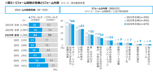 持ち家居住者のリフォームの経験は40%。年代が上がるほどリフォーム経験率は高まり、70代は7割近くと高い。リフォームした内容は、「水まわり設備の改善」68%、「屋根や外壁のリフォーム」53%がTOP2。次いで「壁・天井・床材などの交換」「経年劣化による汚れや痛み、不具合の修繕」「室内の全面改装(リノベーション)」であった。<図5>