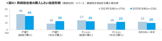 購入したい居住形態は、「戸建て/新築で購入」が40%、「戸建て/中古で購入」と「マンション/新築で購入」が25%であり、2023年より戸建て、マンションともに中古の購入意向者が増加した。<図4>