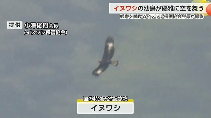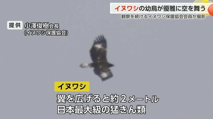 撮影されたイヌワシの幼鳥は、尾羽と翼に白い斑点があるのが特徴で、翼を広げた状態では2メートルほど。