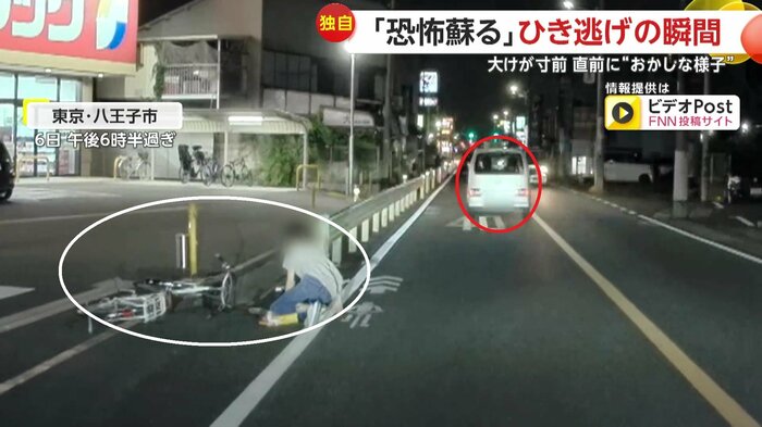 東京・八王子市の車通りが多い道路で6日午後6時半過ぎに撮影されたのは、車が自転車に接触し立ち去るひき逃げの瞬間だった。