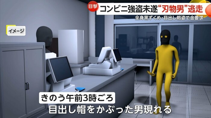 警察によると14日午前3時頃、コンビニに目出し帽をかぶった男が現れ、無言で男性店員(71)に包丁のようなものを突き付け、金を要求。