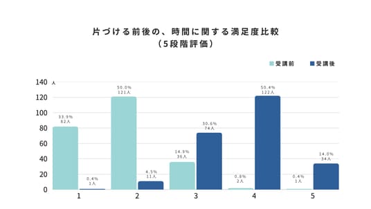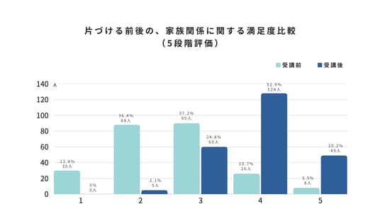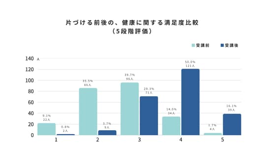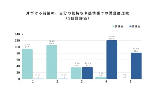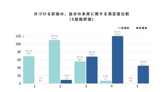 受講を通じて幸福度スコアは平均3.2ポイント(約1.6倍)上昇しており、「片づけ」が心理的ウェルビーイングの回復に寄与することが明らかになりました。