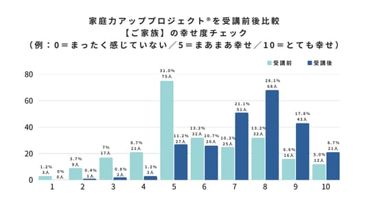 アンケート結果によると、家庭力アッププロジェクト(R)受講後(家を整えた後)の自己幸福度は平均8.1ポイント、受講前(家を整える前)は4.9ポイントでした。